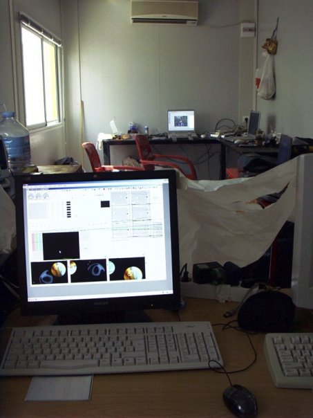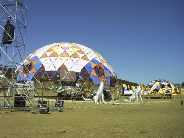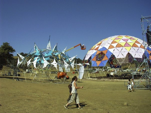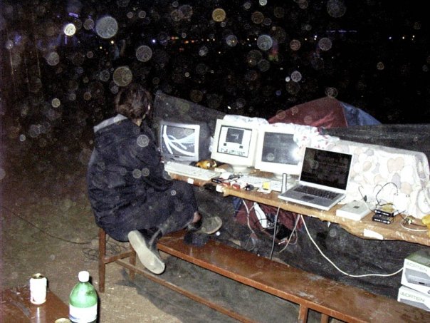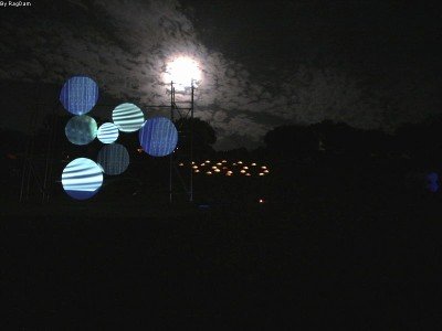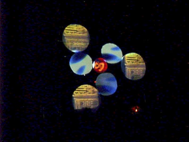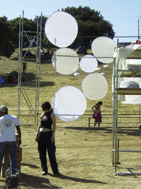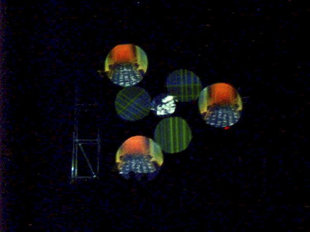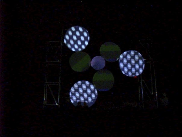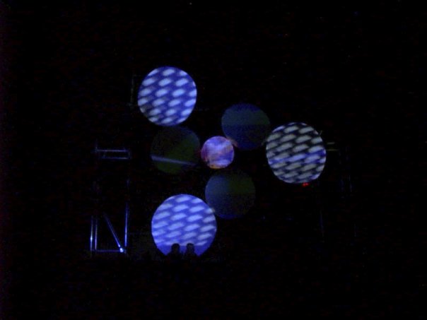 Collaborative video-installation with Ray-V at the Boom Festival 2004. Crop circle shaped screens with mapped video content, all controlled by Max/Jitter.